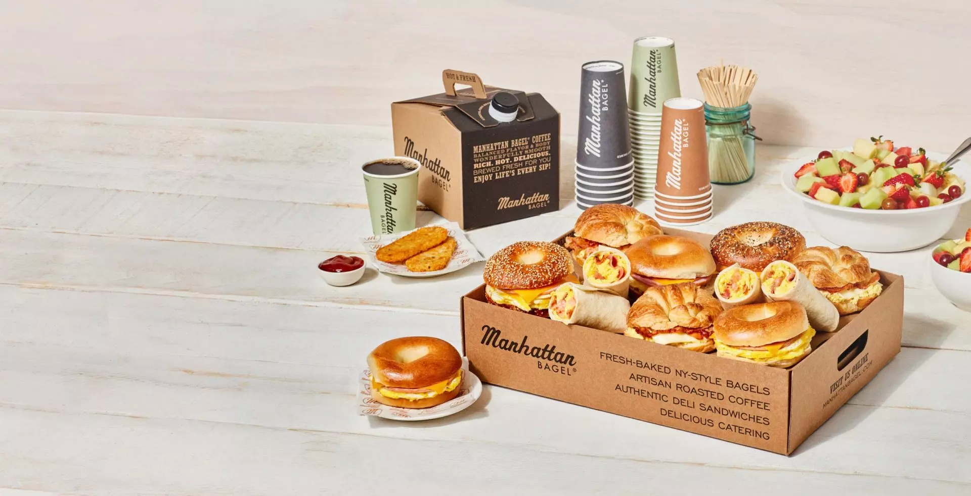 Manhattan Bagel® Catering offers a variety of party platters. Enjoy our selection of sandwiches, salads, sweets, bagels, and coffee for any size or occasion. At least one day before your event, choose from our many breakfast, lunch, dessert, and beverage options. We will prepare everything fresh and deliver it to your door!